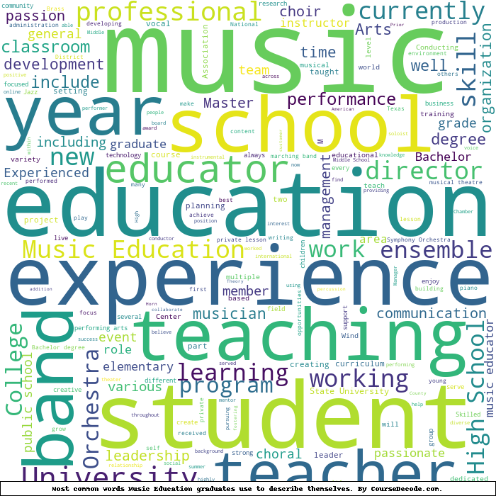 Here is a visual representation of the most common words seen in the "about" section of LinkedIn profiles who have a Bachelor degree in Music Education. This may or may not be useful:
