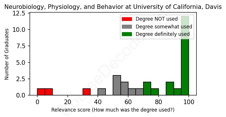 The verdict? Slightly above average. Overall, with an average relevance score of 69%, Neurobiology, Physiology, and Behavior graduates from University of California, Davis have a slightly higher likelihood (+2%) of finding work in this field compared to the average graduate across all fields: