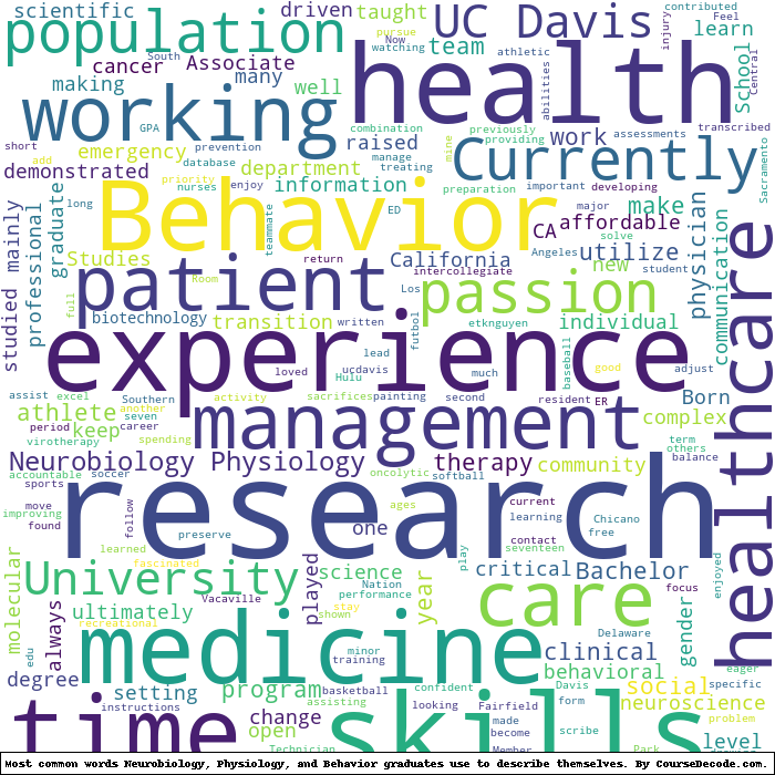 Here is a visual representation of the most common words seen in the "about" section of LinkedIn profiles who have a Bachelor degree in Neurobiology, Physiology, and Behavior (this is across all Neurobiology, Physiology, and Behavior graduates we've analyzed, not just those who went to University of California, Davis). This may or may not be useful: