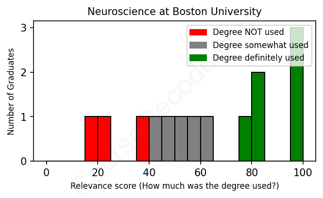 The verdict? Slightly below average. Overall, with an average relevance score of 63%, Neuroscience graduates from Boston University have a slightly lower likelihood (-4%) of finding work in this field compared to the average graduate across all fields: