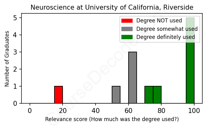 The verdict? Above average. Overall, with an average relevance score of 75%, Neuroscience graduates from University of California, Riverside have a higher likelihood (+8%) of finding work in this field compared to the average graduate across all fields: