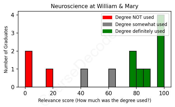 The verdict? Slightly below average. Overall, with an average relevance score of 65%, Neuroscience graduates from William & Mary have a slightly lower likelihood (-2%) of finding work in this field compared to the average graduate across all fields: