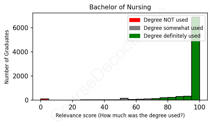The verdict? Great! Overall, with an average relevance score of 93%, Nursing graduates have a substantially higher likelihood (+26%) of finding work in this field compared to the average graduate across all fields: