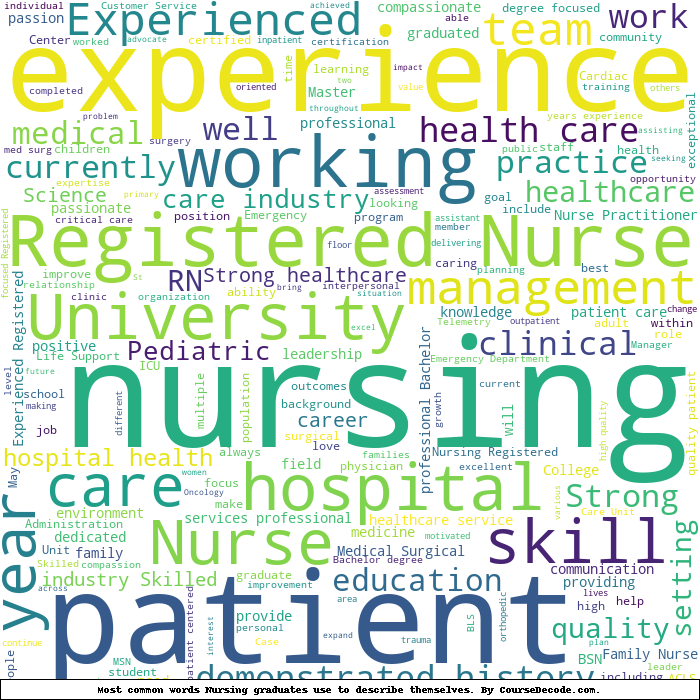 Here is a visual representation of the most common words seen in the "about" section of LinkedIn profiles who have a Bachelor degree in Nursing. This may or may not be useful: