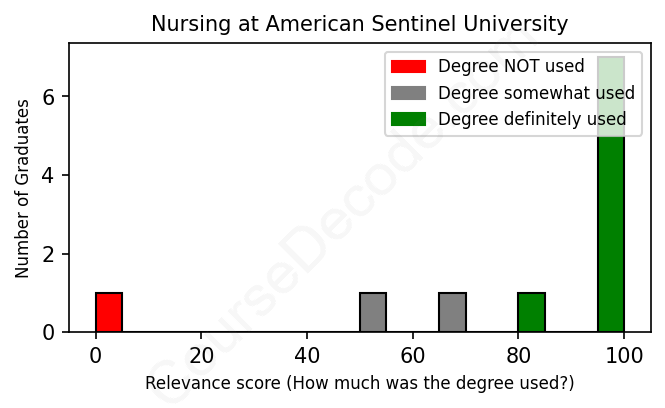 The verdict? Significantly above average. Overall, with an average relevance score of 81%, Nursing graduates from American Sentinel University have a much higher likelihood (+14%) of finding work in this field compared to the average graduate across all fields: