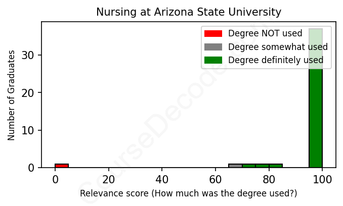 The verdict? Great! Overall, with an average relevance score of 95%, Nursing graduates from Arizona State University have a substantially higher likelihood (+28%) of finding work in this field compared to the average graduate across all fields: