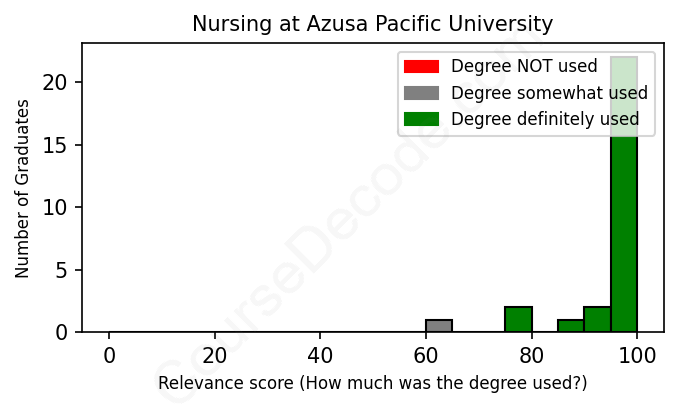 The verdict? Great! Overall, with an average relevance score of 95%, Nursing graduates from Azusa Pacific University have a substantially higher likelihood (+28%) of finding work in this field compared to the average graduate across all fields: