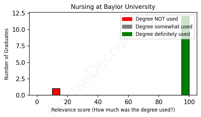 The verdict? Great! Overall, with an average relevance score of 93%, Nursing graduates from Baylor University have a substantially higher likelihood (+26%) of finding work in this field compared to the average graduate across all fields: