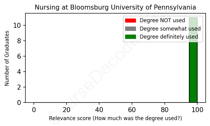 The verdict? Fantastic! Overall, with an average relevance score of 100%, Nursing graduates from Bloomsburg University of Pennsylvania have an exceptionally higher likelihood (+33%) of finding work in this field compared to the average graduate across all fields:
