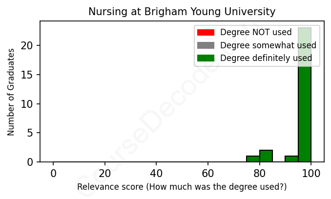 The verdict? Great! Overall, with an average relevance score of 97%, Nursing graduates from Brigham Young University have a substantially higher likelihood (+30%) of finding work in this field compared to the average graduate across all fields: