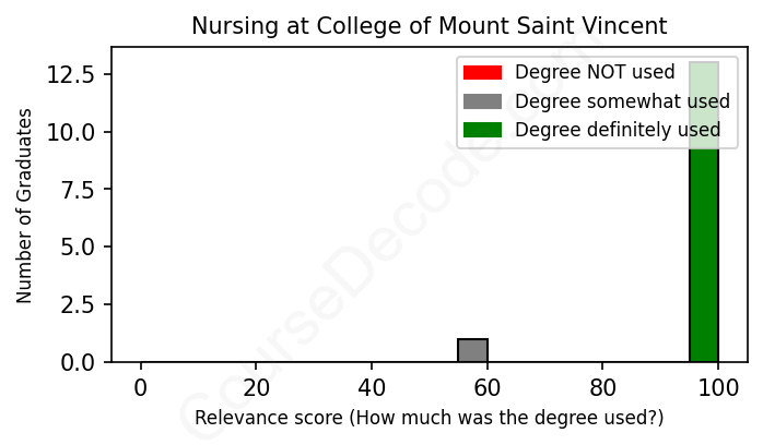 The verdict? Great! Overall, with an average relevance score of 96%, Nursing graduates from College of Mount Saint Vincent have a substantially higher likelihood (+29%) of finding work in this field compared to the average graduate across all fields: