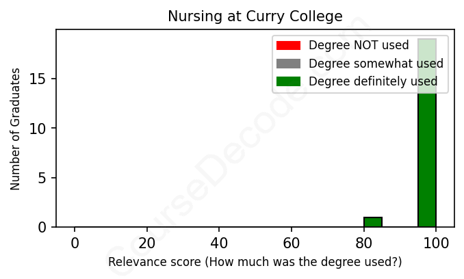 The verdict? Fantastic! Overall, with an average relevance score of 98%, Nursing graduates from Curry College have an exceptionally higher likelihood (+31%) of finding work in this field compared to the average graduate across all fields: