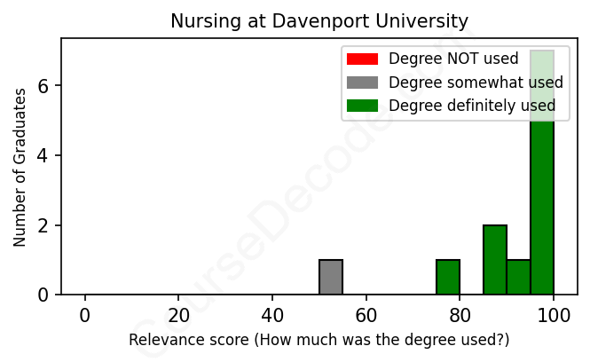 The verdict? Great! Overall, with an average relevance score of 90%, Nursing graduates from Davenport University have a substantially higher likelihood (+23%) of finding work in this field compared to the average graduate across all fields: