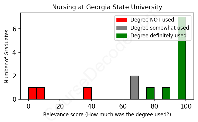 The verdict? Above average. Overall, with an average relevance score of 74%, Nursing graduates from Georgia State University have a higher likelihood (+7%) of finding work in this field compared to the average graduate across all fields: