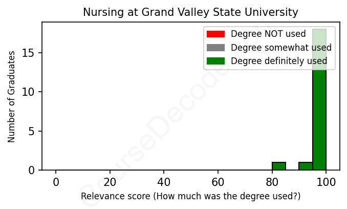The verdict? Fantastic! Overall, with an average relevance score of 98%, Nursing graduates from Grand Valley State University have an exceptionally higher likelihood (+31%) of finding work in this field compared to the average graduate across all fields: