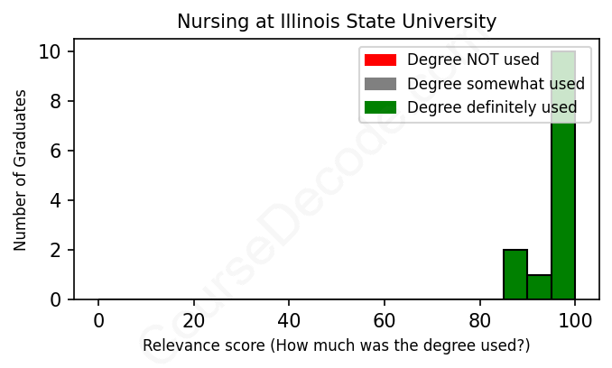 The verdict? Great! Overall, with an average relevance score of 97%, Nursing graduates from Illinois State University have a substantially higher likelihood (+30%) of finding work in this field compared to the average graduate across all fields: