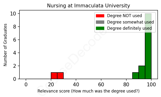 The verdict? Significantly above average. Overall, with an average relevance score of 87%, Nursing graduates from Immaculata University have a much higher likelihood (+20%) of finding work in this field compared to the average graduate across all fields: