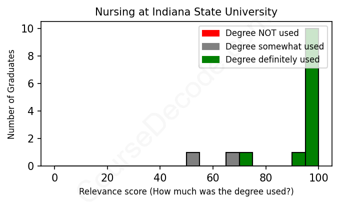 The verdict? Great! Overall, with an average relevance score of 91%, Nursing graduates from Indiana State University have a substantially higher likelihood (+24%) of finding work in this field compared to the average graduate across all fields: