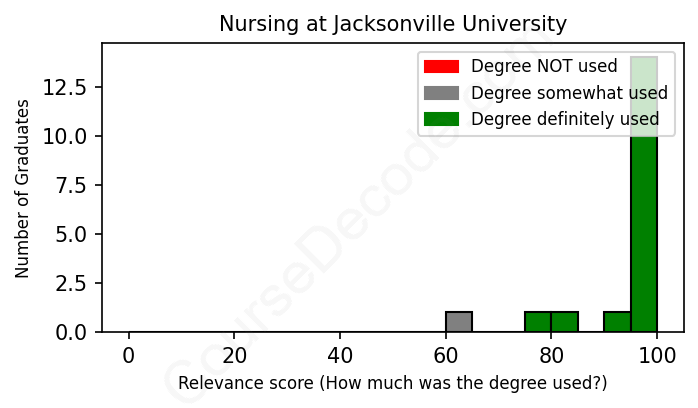 The verdict? Great! Overall, with an average relevance score of 94%, Nursing graduates from Jacksonville University have a substantially higher likelihood (+27%) of finding work in this field compared to the average graduate across all fields: