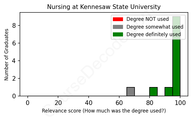 The verdict? Great! Overall, with an average relevance score of 95%, Nursing graduates from Kennesaw State University have a substantially higher likelihood (+28%) of finding work in this field compared to the average graduate across all fields: