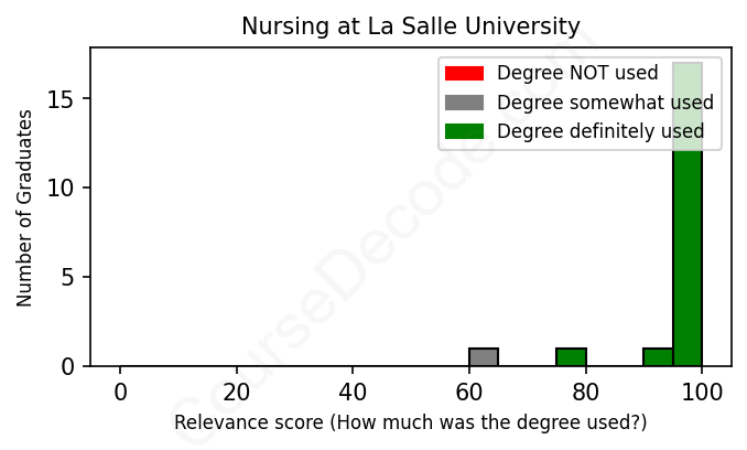 The verdict? Great! Overall, with an average relevance score of 96%, Nursing graduates from La Salle University have a substantially higher likelihood (+29%) of finding work in this field compared to the average graduate across all fields:
