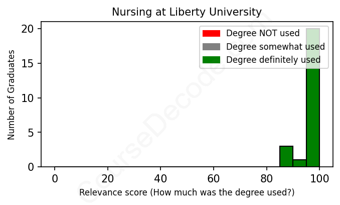 The verdict? Fantastic! Overall, with an average relevance score of 98%, Nursing graduates from Liberty University have an exceptionally higher likelihood (+31%) of finding work in this field compared to the average graduate across all fields: