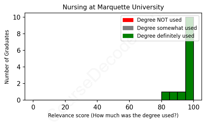 The verdict? Great! Overall, with an average relevance score of 96%, Nursing graduates from Marquette University have a substantially higher likelihood (+29%) of finding work in this field compared to the average graduate across all fields: