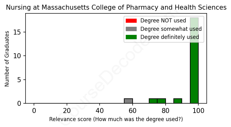 The verdict? Great! Overall, with an average relevance score of 94%, Nursing graduates from Massachusetts College of Pharmacy and Health Sciences have a substantially higher likelihood (+27%) of finding work in this field compared to the average graduate across all fields: