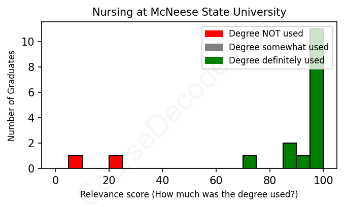 The verdict? Significantly above average. Overall, with an average relevance score of 86%, Nursing graduates from McNeese State University have a much higher likelihood (+19%) of finding work in this field compared to the average graduate across all fields: