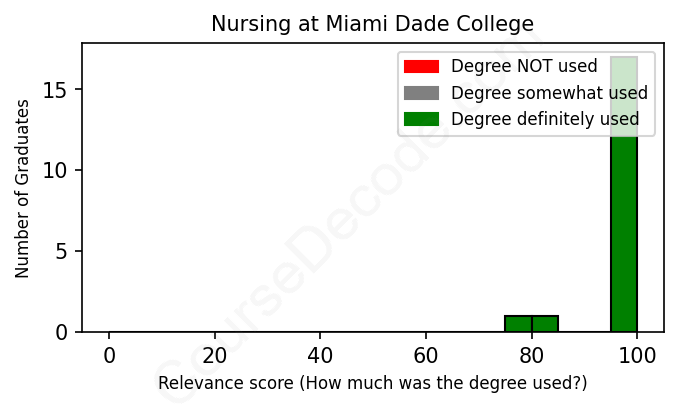 The verdict? Great! Overall, with an average relevance score of 97%, Nursing graduates from Miami Dade College have a substantially higher likelihood (+30%) of finding work in this field compared to the average graduate across all fields: