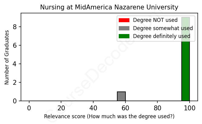 The verdict? Great! Overall, with an average relevance score of 95%, Nursing graduates from MidAmerica Nazarene University have a substantially higher likelihood (+28%) of finding work in this field compared to the average graduate across all fields: