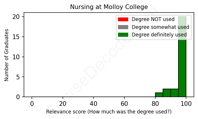 The verdict? Great! Overall, with an average relevance score of 97%, Nursing graduates from Molloy College have a substantially higher likelihood (+30%) of finding work in this field compared to the average graduate across all fields: