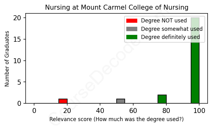 The verdict? Great! Overall, with an average relevance score of 92%, Nursing graduates from Mount Carmel College of Nursing have a substantially higher likelihood (+25%) of finding work in this field compared to the average graduate across all fields: