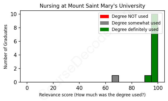 The verdict? Great! Overall, with an average relevance score of 96%, Nursing graduates from Mount Saint Mary's University have a substantially higher likelihood (+29%) of finding work in this field compared to the average graduate across all fields: