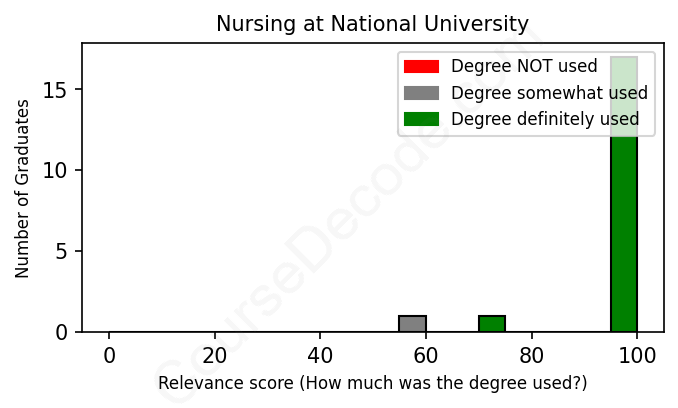 The verdict? Great! Overall, with an average relevance score of 96%, Nursing graduates from National University have a substantially higher likelihood (+29%) of finding work in this field compared to the average graduate across all fields:
