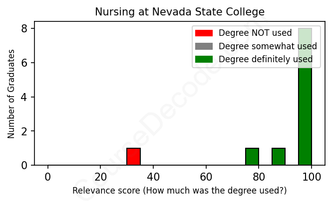 The verdict? Great! Overall, with an average relevance score of 90%, Nursing graduates from Nevada State College have a substantially higher likelihood (+23%) of finding work in this field compared to the average graduate across all fields: