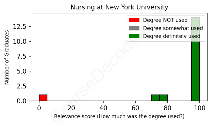 The verdict? Great! Overall, with an average relevance score of 91%, Nursing graduates from New York University have a substantially higher likelihood (+24%) of finding work in this field compared to the average graduate across all fields: