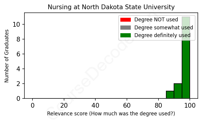 The verdict? Fantastic! Overall, with an average relevance score of 98%, Nursing graduates from North Dakota State University have an exceptionally higher likelihood (+31%) of finding work in this field compared to the average graduate across all fields: