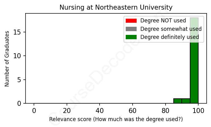 The verdict? Fantastic! Overall, with an average relevance score of 98%, Nursing graduates from Northeastern University have an exceptionally higher likelihood (+31%) of finding work in this field compared to the average graduate across all fields: