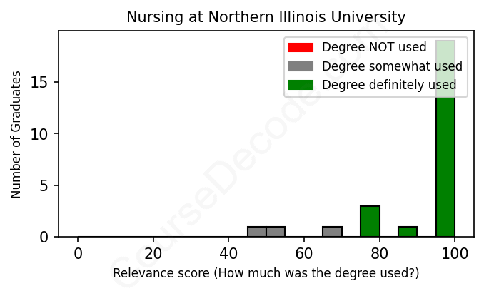 The verdict? Great! Overall, with an average relevance score of 91%, Nursing graduates from Northern Illinois University have a substantially higher likelihood (+24%) of finding work in this field compared to the average graduate across all fields: