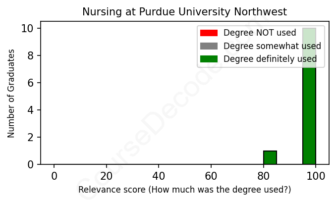 The verdict? Fantastic! Overall, with an average relevance score of 98%, Nursing graduates from Purdue University Northwest have an exceptionally higher likelihood (+31%) of finding work in this field compared to the average graduate across all fields: