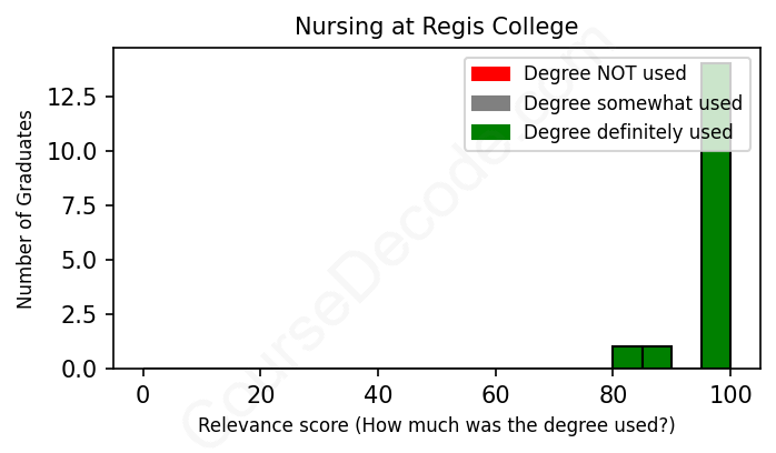 The verdict? Fantastic! Overall, with an average relevance score of 98%, Nursing graduates from Regis College have an exceptionally higher likelihood (+31%) of finding work in this field compared to the average graduate across all fields: