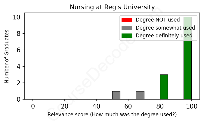 The verdict? Great! Overall, with an average relevance score of 90%, Nursing graduates from Regis University have a substantially higher likelihood (+23%) of finding work in this field compared to the average graduate across all fields: