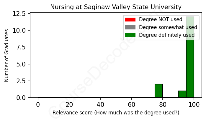 The verdict? Great! Overall, with an average relevance score of 96%, Nursing graduates from Saginaw Valley State University have a substantially higher likelihood (+29%) of finding work in this field compared to the average graduate across all fields: