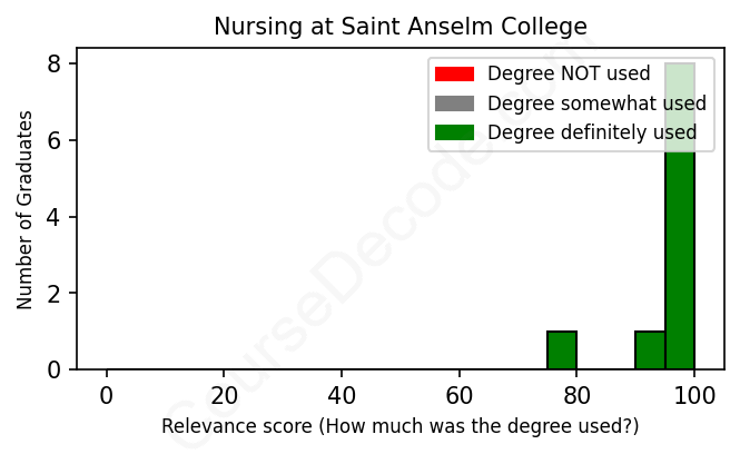 The verdict? Great! Overall, with an average relevance score of 96%, Nursing graduates from Saint Anselm College have a substantially higher likelihood (+29%) of finding work in this field compared to the average graduate across all fields: