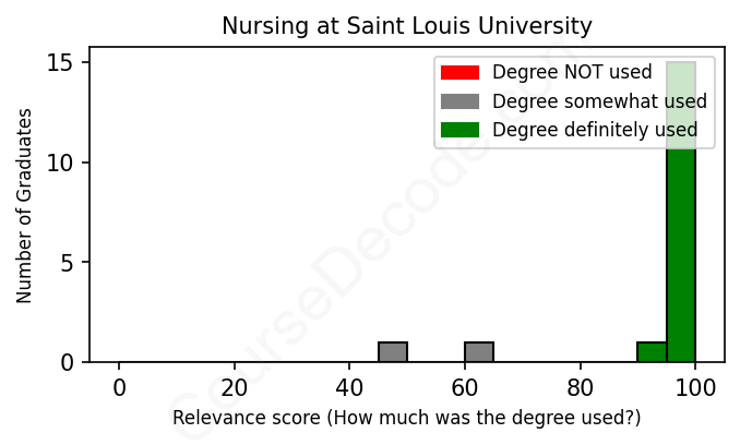 The verdict? Great! Overall, with an average relevance score of 94%, Nursing graduates from Saint Louis University have a substantially higher likelihood (+27%) of finding work in this field compared to the average graduate across all fields: