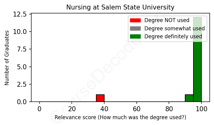 The verdict? Great! Overall, with an average relevance score of 95%, Nursing graduates from Salem State University have a substantially higher likelihood (+28%) of finding work in this field compared to the average graduate across all fields:
