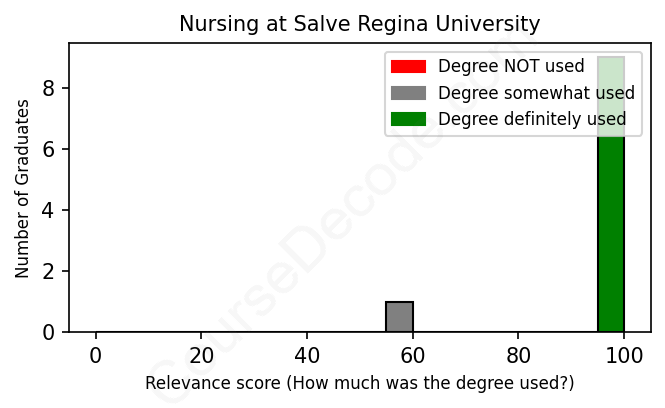 The verdict? Great! Overall, with an average relevance score of 95%, Nursing graduates from Salve Regina University have a substantially higher likelihood (+28%) of finding work in this field compared to the average graduate across all fields: