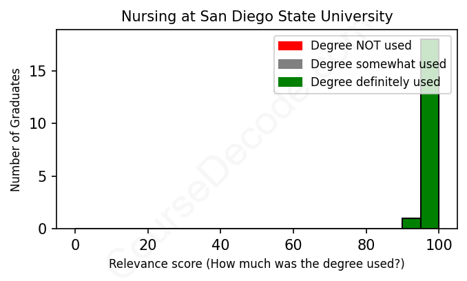 The verdict? Fantastic! Overall, with an average relevance score of 99%, Nursing graduates from San Diego State University have an exceptionally higher likelihood (+32%) of finding work in this field compared to the average graduate across all fields: