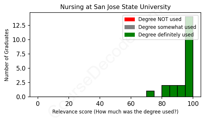 The verdict? Great! Overall, with an average relevance score of 94%, Nursing graduates from San Jose State University have a substantially higher likelihood (+27%) of finding work in this field compared to the average graduate across all fields: